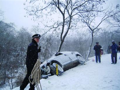 ????昨日下午1時30分,開發(fā)區(qū)公安局110指揮中心接到報警稱,在珠山景區(qū)一切智園水庫以北區(qū)域路邊,一輛轎車因雪天路滑側翻在路邊的峭壁上,被一棵大樹擋住,遇險人員均困在車內沒有出來。接警后,靈珠山派出所民警迅速帶著繩索等救援工具趕往現場。趕到現場民警看到,一輛黑色福克斯轎車翻進路邊的峭壁,幸運地被一棵大樹擋住,車左側前輪掛在路基上,隨時有墜落的可能,處境十分危險。