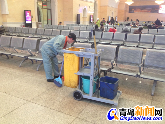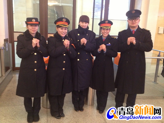 隨著最后一列離開青島的5022次列車檢票時間的臨近,一群年紀不大的青年人映入記者眼簾,他們是青島火車站的工作人員,這是一個80后集體。記者得知其中一位姑娘近年來除夕一直堅守崗位,轉眼已有四個年頭沒回家過年了。她說:“其實第一年心里挺難受的,會想爸媽,但是看到這么多的人除夕在路上,我們作為鐵路工作人員,保駕護航是我們義不容辭的。”