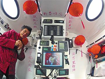 ????根據(jù)中國的傳統(tǒng)習(xí)俗,除夕上午就要把春聯(lián)貼起來,雖然遠離家鄉(xiāng),歸心似箭的郭川卻未能免俗。昨天,他在“青島號”上因陋就簡,用紅色字跡的中性筆在船艙內(nèi)壁上“揮毫潑墨”,寫了一副“春聯(lián)”。上聯(lián)書:遠影雖遠,四萬里即歸;下聯(lián)書:孤帆不孤,十億人同在;橫批:新春快樂。上聯(lián)和下聯(lián)之間的顯示屏上,郭川剛滿一周歲的小兒子郭倫布的照片分外醒目。