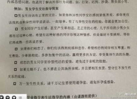 ????對于網(wǎng)友的一些質(zhì)疑,王老師認(rèn)為高中生的感情問題是疏勝于堵:“材料里面對性關(guān)系的問題描述,并不是提倡,只是為了讓學(xué)生們更好認(rèn)識這一問題,避免他們因為無知而造成更壞的結(jié)果。”(記者 潘立超 劉金德 實習(xí)生 郭坤)(圖片為網(wǎng)絡(luò)截圖)