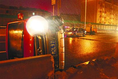 記者在現(xiàn)場采訪時,發(fā)現(xiàn)離事發(fā)地不足10米處,還有一輛長城車側(cè)翻在快速路上。“當(dāng)時這輛越野車發(fā)生事故后,這輛出租車就停在路口看熱鬧,也沒打開雙閃。”目擊者告訴記者,結(jié)果這輛出租車停下不久,后面就駛來一輛長城兩廂轎車,因為雨天視線受阻,再加上路面濕滑,這輛長城轎車在離出租車10米遠的地方才發(fā)現(xiàn)前方停著一輛車,急打方向已經(jīng)來不及,一頭撞在出租車的左后側(cè),失去平衡后,這輛長城轎車發(fā)生了側(cè)翻。