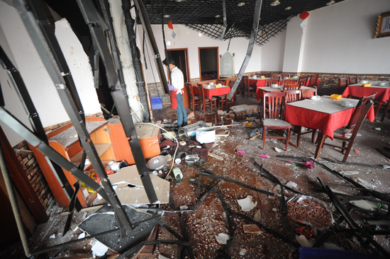 在飯店內(nèi)記者看到,整座飯店內(nèi)部墻磚掉落,桌椅散落在地上,天花板被炸開。門口地上都是鋁合金門窗的碎片,現(xiàn)場(chǎng)一片狼藉。