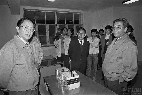 1992年3月11日發(fā),山東青島市市長俞正聲(左一)與國務(wù)委員陳俊生(中、穿黑衣者)、市委書記郭松年(右一)在青島經(jīng)濟(jì)開發(fā)區(qū)生產(chǎn)錄相帶的合資企業(yè)現(xiàn)場辦公。新華社/李錦