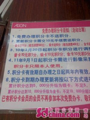 3月12日中午,中國山東網青島頻道記者來到佳世客香港中路店服務中心,記者看到在服務中心柜臺顯眼的位置,貼了一張辦理積分卡須知,根據須知內容顯示,積分卡有效期自辦理之日起兩年內有效,到期更新積分卡需交10元手續費。積分卡積分原則為,普卡10元積一分,銀卡10元積2分,金卡10元積3分。