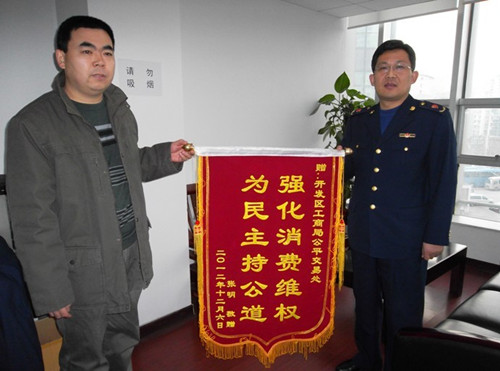 ????近日,消費者張明手持印有“強化消費維權,為民主持公道”字樣的錦旗,來到青島市工商局開發區分局公平交易處,大力贊揚分局公平交易處執法為民,熱情服務的工作作風,對分局公平交易處工作人員挽回其上萬元的經濟損失表示誠摯地感謝。 ????去年,消費者張明在互聯網上發現某樓盤開發商正在進行“特價房源優惠促銷活動”的宣傳,遂按照宣傳所述內容,前往樓盤售樓處交付款項。但開發商方面卻不按網絡宣 ????這只是分局履行消費維權職能,提供優質服務的縮影之一,今年以來,開發區分局按照國家總局及省、市局相關部署,進一步更新消費維權理念,以12315指揮中心為依托,積極開展消費維權宣傳教育,創新消費教育的形式和內容。在原有工作基礎上,繼續加強12315行政執法體系建設,大力查辦消費侵權違法案件,積極維護人民群眾合法權益,維護社會和諧穩定。截至目前,查辦消費維權違法案件68起,罰沒款24.68萬元,受理咨詢、申訴、舉報805件,為消費者挽回經濟損失12.14萬元,處結率、反饋率100%,群眾滿意率達到100%。 |
