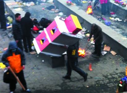 ????記者沿重慶南路通往殯儀館正門的道路往坡上走,發(fā)現(xiàn)道路兩側有10多家經營鮮花和喪葬用品的店鋪,遠遠看去,多家店鋪中隱約擺放著紙人紙馬。“我這里有3種檔次,從280元一套到980元一套的都有。”記者走進一家喪葬用品店,女店主從門口的路邊攤跑過來招呼。店主告訴記者,檔次最高的套系中包括目前最流行的“十大件”:童男童女、牛馬、冰箱、彩電、空調、金庫銀庫、i-phone手機、豪華小轎車、筆記本電腦和仿真美元。“你在我店里買,我就負責給你帶進殯儀館祭奠區(qū),到了那里就可以隨便燒了。”女店主說。