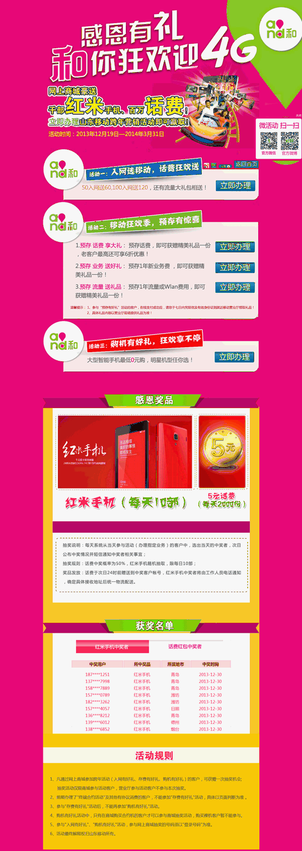 ????通過網上商城參加山東移動跨年活動(入網有好禮、預存有好禮、購機有好禮)的客戶,可獲贈一次抽獎機會。獎品為:紅米手機(每天10部)、5元話費(每天2000份)。