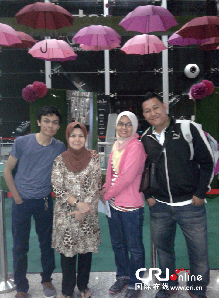 當地時間2014年3月7日,馬來西亞吉隆坡, Norliakmar Hamid(右二)和丈夫Razahan Zamani(右)在乘機前與家人合影。