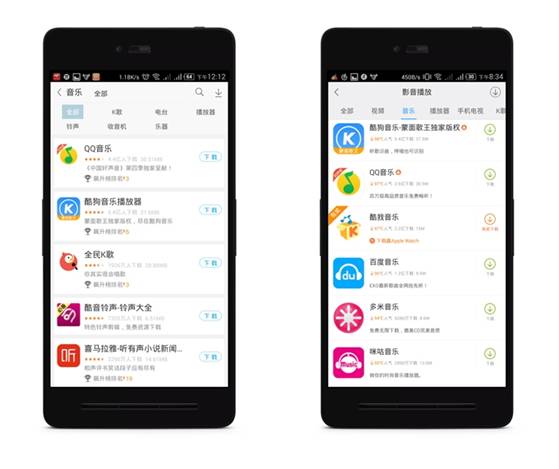 ??? 首先看應用寶,雖然后者未給出具體排名,但從下載量上不難看出,酷狗音樂以5.4億次下載量排名首位,緊隨其后的是QQ音樂,下載量為4.4億;在星級評分上,酷狗音樂也以4星半的評分,領先于QQ音樂的4星。值得一提的是,出于競爭和版權原因,應用寶并未收入其它兩款作品。