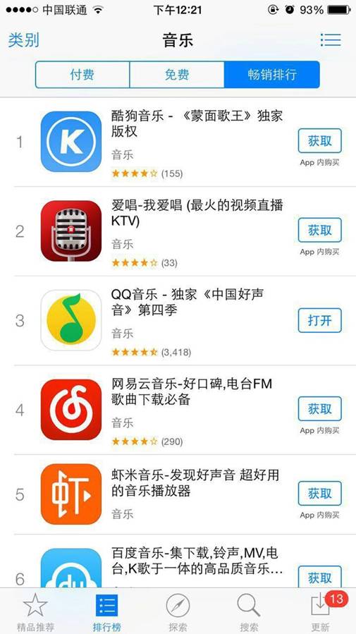 ??? 在iOS系統上,我們直接檢索的的是App?Store音樂App暢銷排行榜,而這一次,酷狗音樂依舊雄踞榜首之位,第二位為新晉的唱歌App愛唱,QQ音樂、網易云音樂以及蝦米音樂,則分別排行3、4、5位,酷我音樂在這一項上的表現不敵網易云音樂和蝦米音樂,排在另外一款音樂App百度音樂之后,位列總榜第7名。
