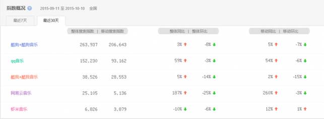 ??? 相比之下,酷我音樂則相對表現平平,其30天內整體搜索指數上漲了5%,移動搜索指數上漲了2%。而比起QQ音樂僅兩位數的增長量,網易云音樂雙雙破百的增長速度顯然更為顯眼,其30天內整體搜索指數大漲了187%,移動搜索指數更是暴漲了260%;相比之下,蝦米音樂則略顯低迷,雖然移動搜索指數同比上漲了12%,但整體搜索指數仍下跌10%。