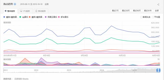 ??? 百度指數方面,筆者直接截取了5款音樂App近30天的整體搜索指數與移動搜素指數,可以看到,酷狗音樂在總體搜索指數上(整體+移動)均領先于其它4款產品,而5款App的整體排序也基本與此前應用市場的表現一致。