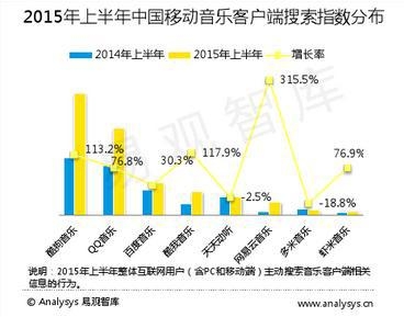 ??? 在知名數據機構易觀智庫給出的數據中,酷狗音樂在2015年上半年位居搜索指數榜首之位,增長率高達113.2%;QQ音樂則位居其次,增長率為76.8%;酷我音樂依舊排行第三,增長率為30.3%。不過相比之下,網易云音樂雖然總體搜索指數較低,但增長率卻再次登頂,達到了驚人的315.5%;蝦米音樂也同樣表現突出,增長率微超QQ音樂,達到了76.9%。