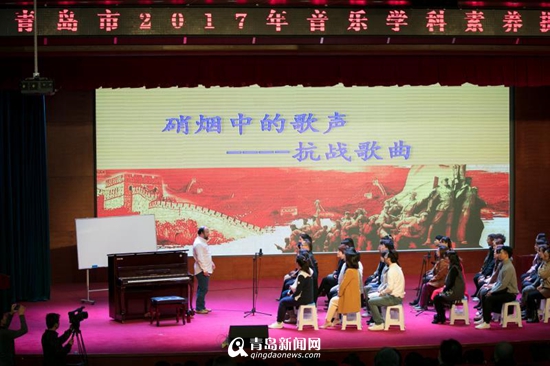 高中學段的課例《硝煙中的歌曲》執教者為青島平度一中老師陳常臺。教師引導學生通過多首抗戰歌曲,體會歌曲在特殊時代的激勵作用,并通過演、模、誦、唱等音樂實踐活動,讓學生深深被抗戰音樂所感動,課堂在全場起立高唱《義勇軍進行曲》中達到了高潮,民族自豪感油然而生。