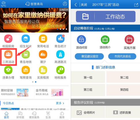 2017年向市民報告、聽市民意見、請市民評議活動(以下簡稱“三民”活動)日前已正式啟動,為了更加充分的傾聽民聲、匯聚民智,進一步促進政府工作作風轉變和效能提升,活動正面向全市征求意見建議,市民可通過青島政務網、智慧青島APP等媒體“三民”活動網上意見建議征集欄目對島城的建設和發展建言獻策。