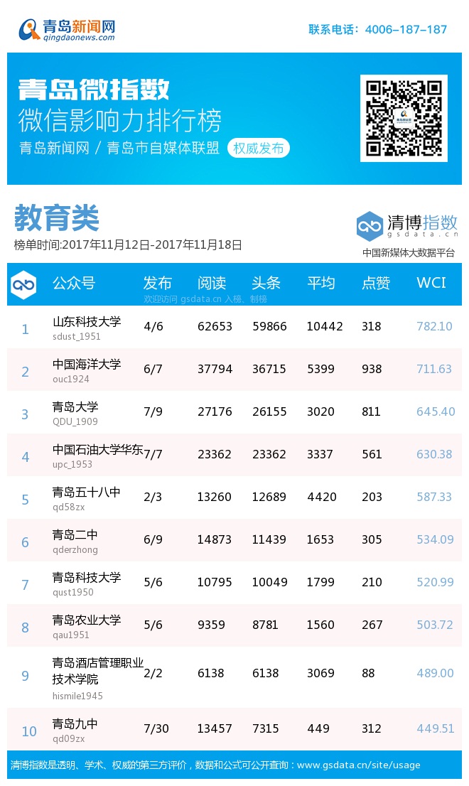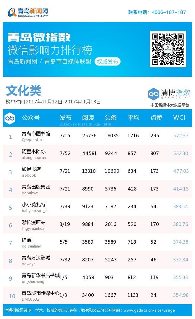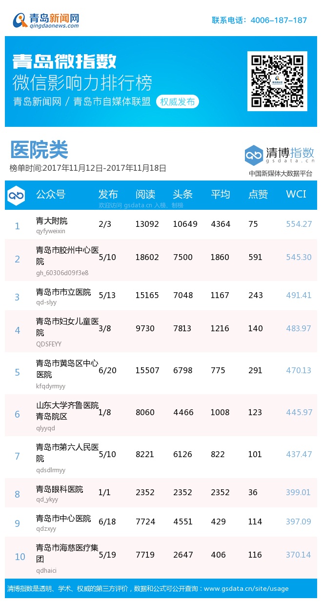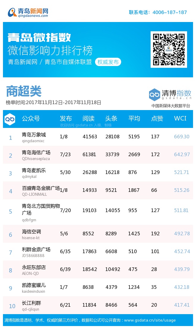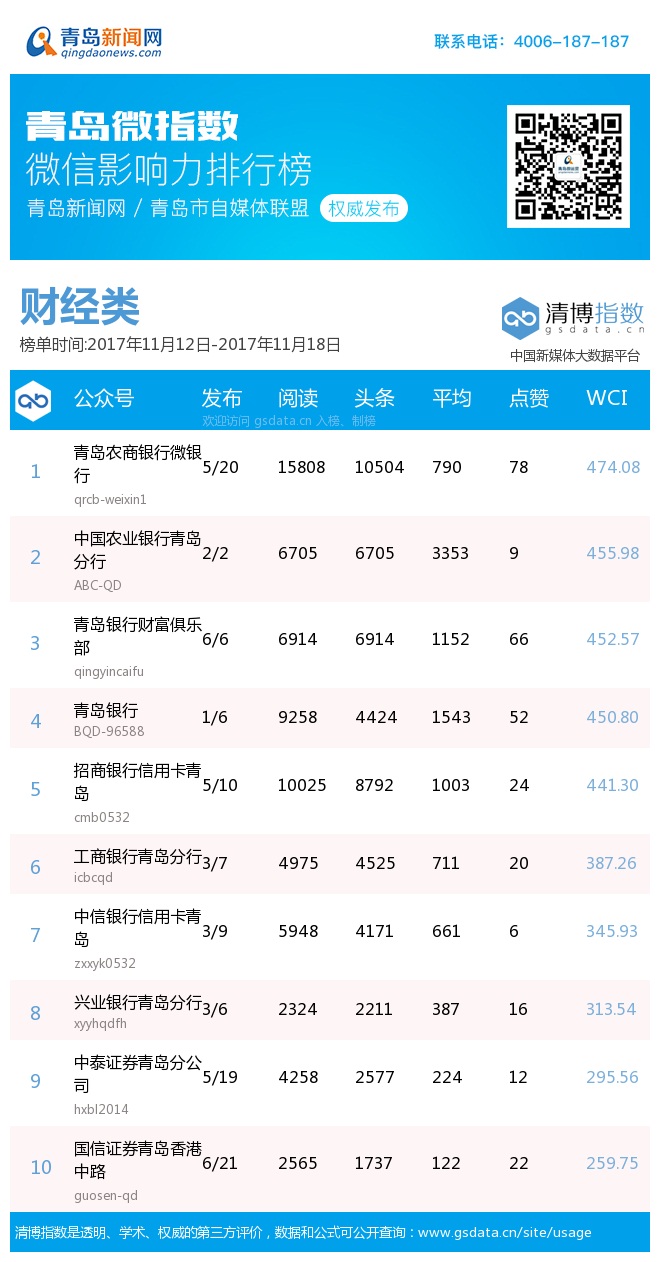 3、本次榜單收錄了青島13個(gè)行業(yè)微信公眾號(hào),如您的賬號(hào)暫未收錄,可聯(lián)系4006-187-187。