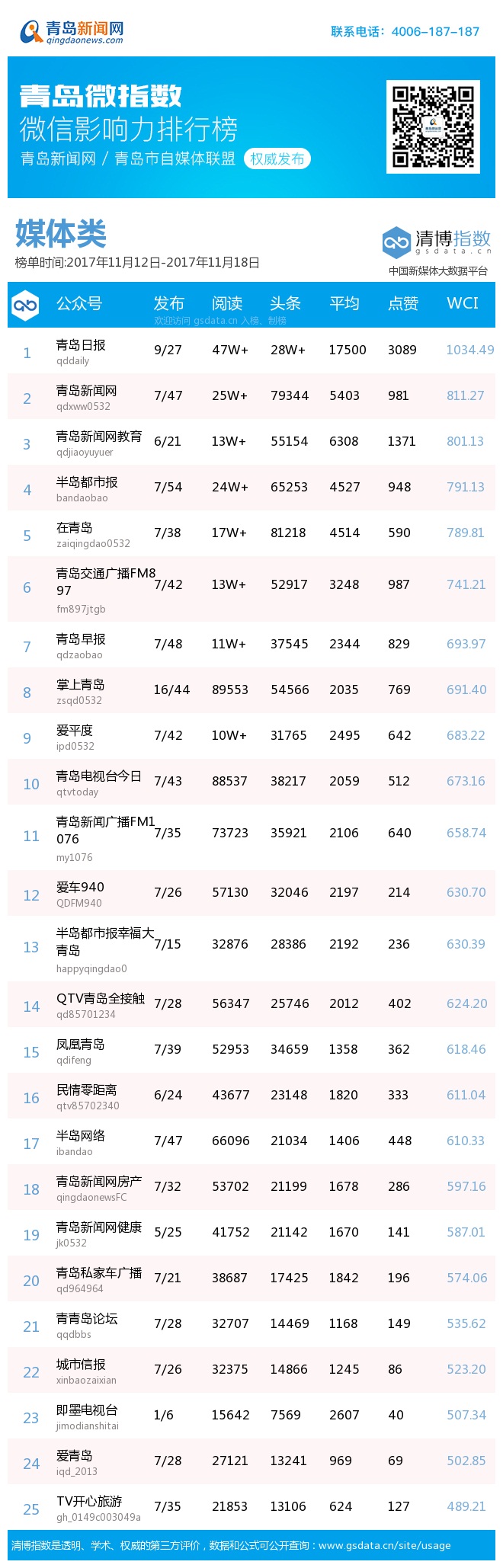 由青島新聞網(wǎng)聯(lián)合清博指數(shù)平臺(tái)聯(lián)手打造的“青島微指數(shù)微信影響力排行榜”,通過(guò)對(duì)各行業(yè)微信公眾號(hào)的日常監(jiān)測(cè),對(duì)所有賬號(hào)在統(tǒng)計(jì)周期內(nèi)所發(fā)布內(nèi)容的發(fā)文總數(shù)、總閱讀數(shù)、頭條閱讀數(shù)、平均閱讀數(shù)及總點(diǎn)贊數(shù)等海量數(shù)據(jù)進(jìn)行分析,幫助各行業(yè)新媒體小編更好地運(yùn)營(yíng)微信。