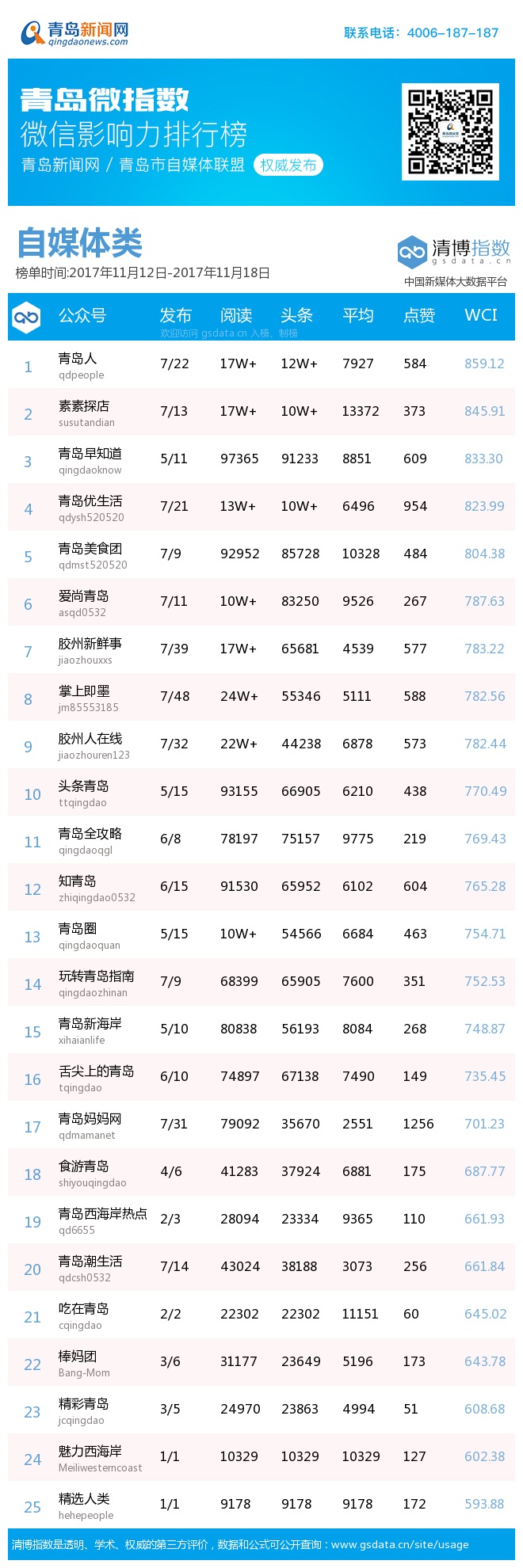 自媒體榜單中“青島人”憑借一篇“明天起,青島人將要身價(jià)暴漲!!!”文章,由上周的第13名躍居本期榜首,WCI指數(shù)從上周的744.38上升到859.12,該文章也以閱讀69681次,點(diǎn)贊245次的成績(jī)高居自媒體類(lèi)文章第一名。