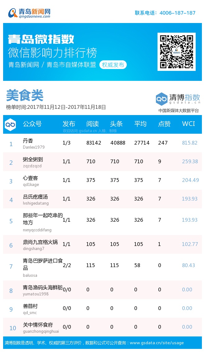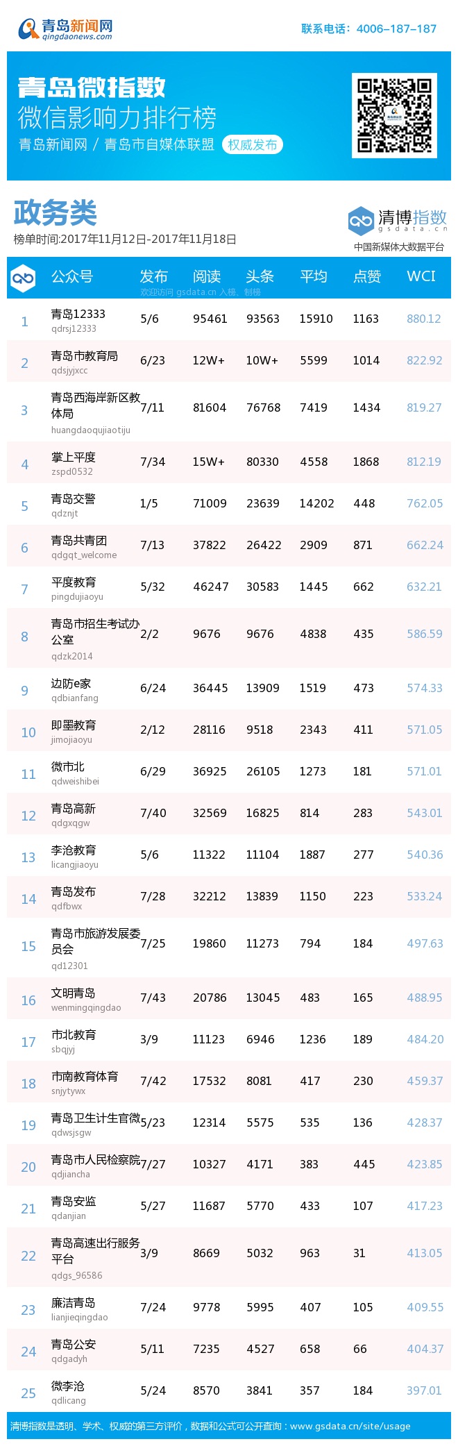 1、“青島微指數(shù)微信影響力排行榜”由青島新聞網(wǎng)微運(yùn)營(yíng)整理發(fā)布。數(shù)據(jù)來(lái)自清博指數(shù)。更多信息請(qǐng)關(guān)注。