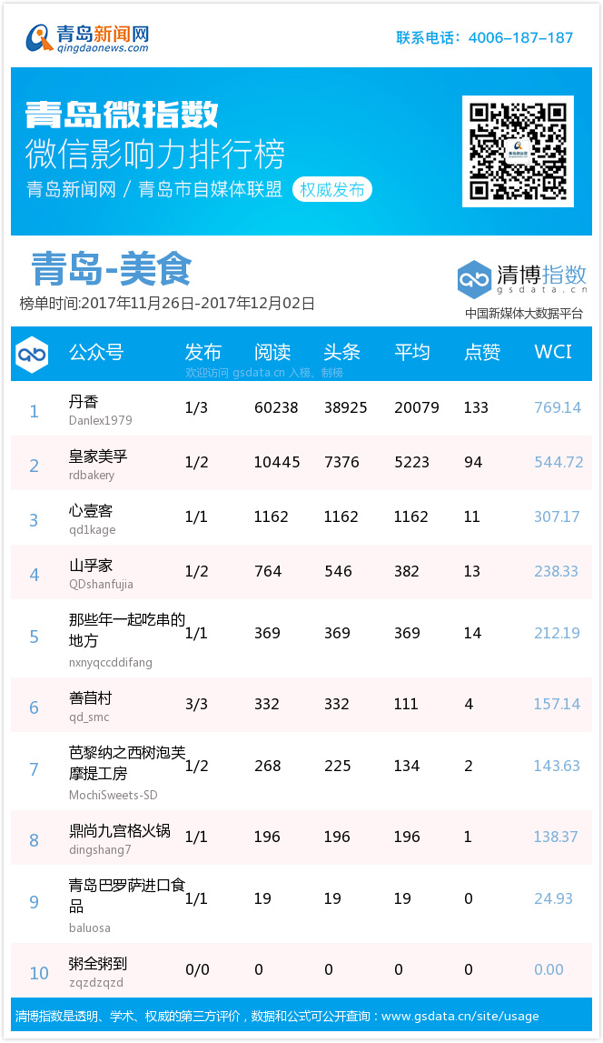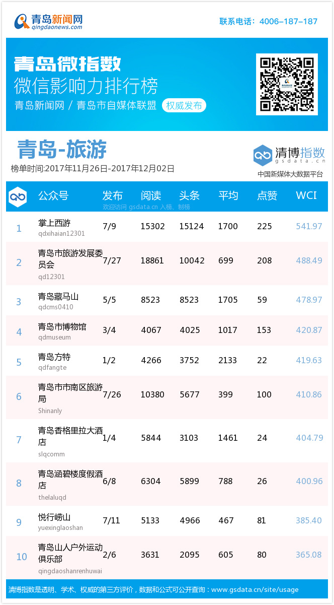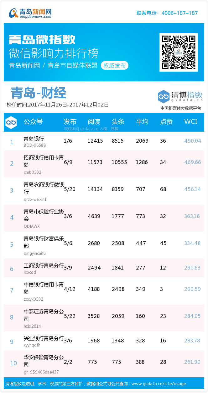 3、本次榜單收錄了青島13個行業微信公眾號,如您的賬號暫未收錄,可聯系4006-187-187。