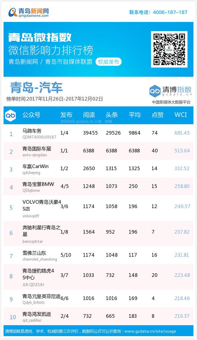 由青島新聞網聯合清博指數平臺聯手打造的“青島微指數微信影響力排行榜”,通過對各行業微信公眾號的日常監測,對所有賬號在統計周期內所發布內容的發文總數、總閱讀數、頭條閱讀數、平均閱讀數及總點贊數等海量數據進行分析,幫助各行業新媒體小編更好地運營微信。