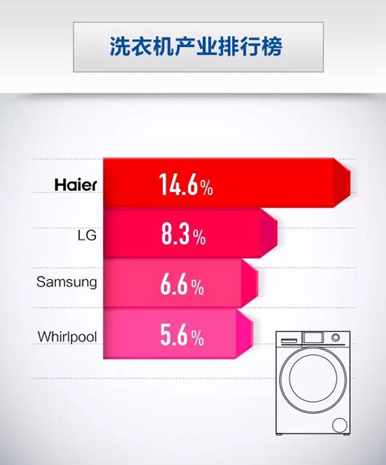 海爾洗衣機:以14.6%的全球洗衣機市場品牌份額位居第一,創(chuàng)造連續(xù)9年蟬聯(lián)全球冠軍的新紀錄。