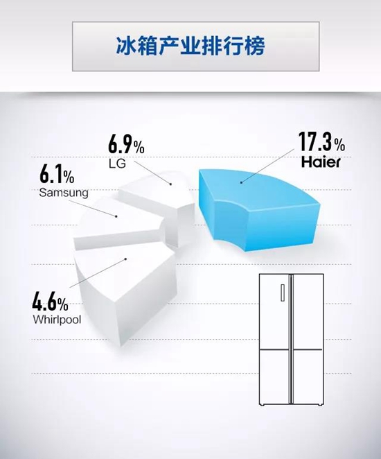 海爾冰箱:2017年,海爾冰箱以17.3%市場份額,連續(xù)10年蟬聯(lián)全球第一品牌,再次刷新行業(yè)紀錄。