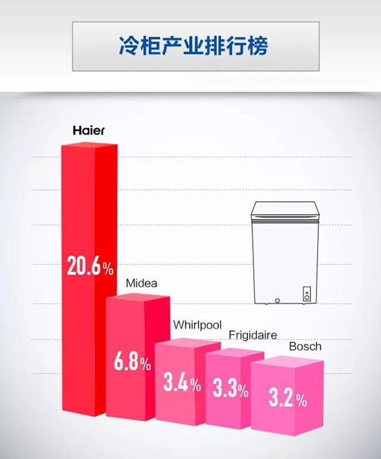 海爾冷柜:2017年,海爾冷柜以20.6%的品牌份額第7次蟬聯(lián)全球第一