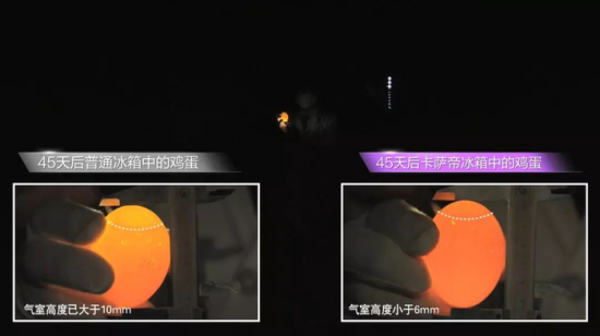 實(shí)驗(yàn)人員將2組氣室近乎沒(méi)有的新鮮雞蛋分別放入普通冰箱與卡薩帝F+冰箱內(nèi),45天后取出,對(duì)其氣室再次進(jìn)行觀察