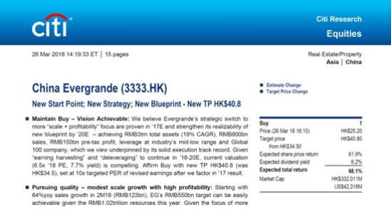 花旗認為:“恒大的新藍圖,是建基于過往的業績支撐,以及強大的執行力,我們認為實現的可能性非常高?!辈⑸险{高其目標價至40.8港元。此外,包括星展、瑞信在內的國際投行均唱多恒大未來發展,予以“買入”及“跑贏大市”的正面評級。