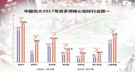 許家印所描繪的藍圖,以2017年恒大實現的佳績為新起點。數據顯示,恒大2017年毛利潤1122.6億,同比增88.9%;毛利率36.1%,同比增8個百分點;核心利潤405.1億元,同比增94.7%;核心利潤率13%;同比增3.2個百分點;凈利潤370.5億元,同比增110.3%。