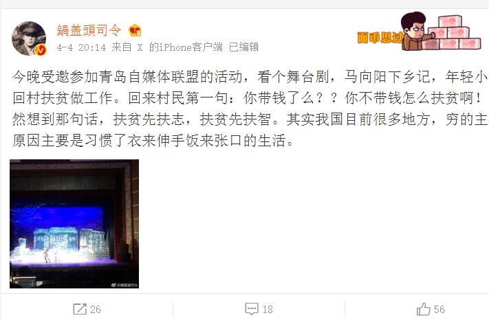 青島市自媒體聯盟理事、國內知名微博大V鍋蓋頭司令創始人姜騰看完《馬向陽下鄉記》后感觸頗深。歌劇中馬向陽回到家鄉做扶貧工作,村民們第一句話卻是:你帶錢了嗎?你不帶錢怎么扶貧啊!“突然想到那句話,扶貧先扶志,扶貧先扶智。”姜騰在自己的微博號上寫道。