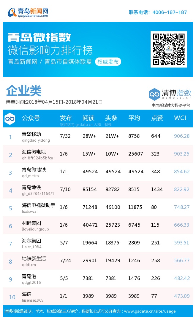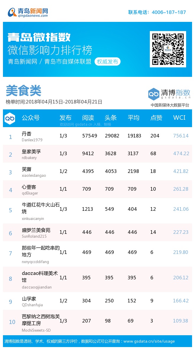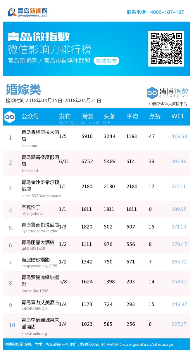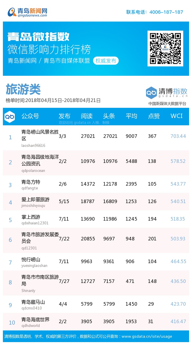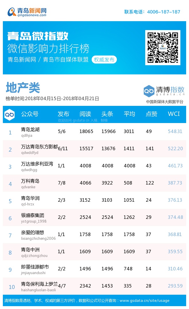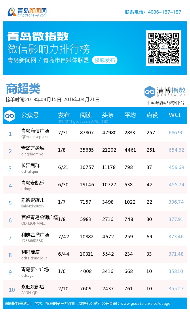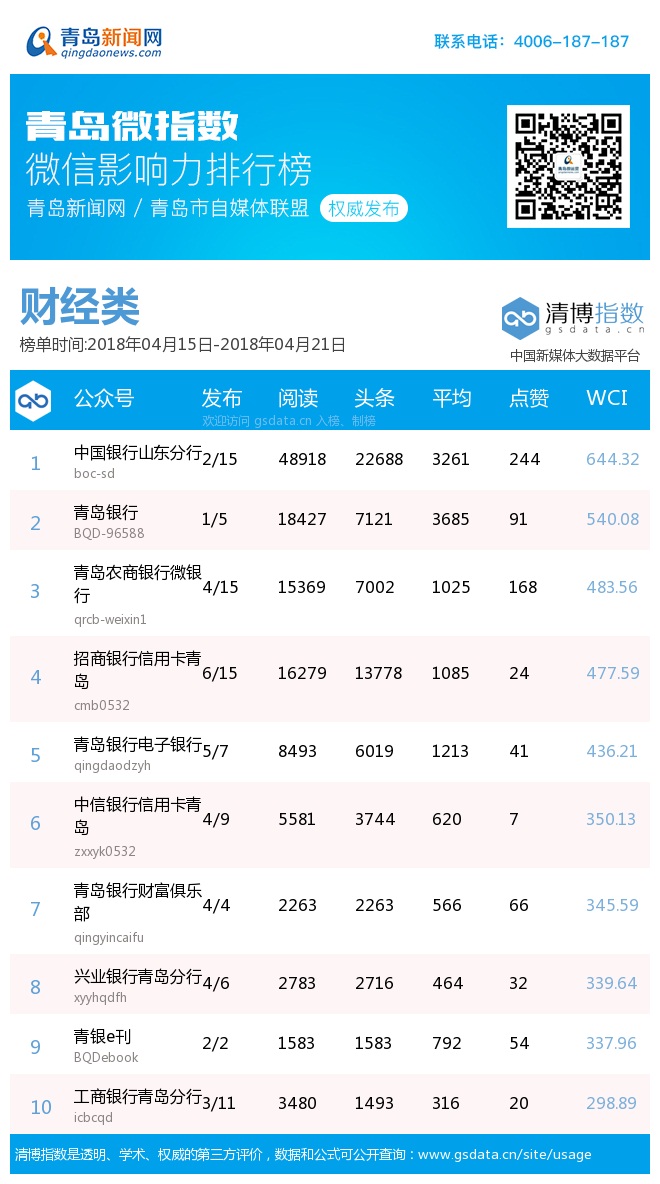 3、本次榜單收錄了青島14個行業微信公眾號,如您的賬號暫未收錄,可聯系4006-187-187。