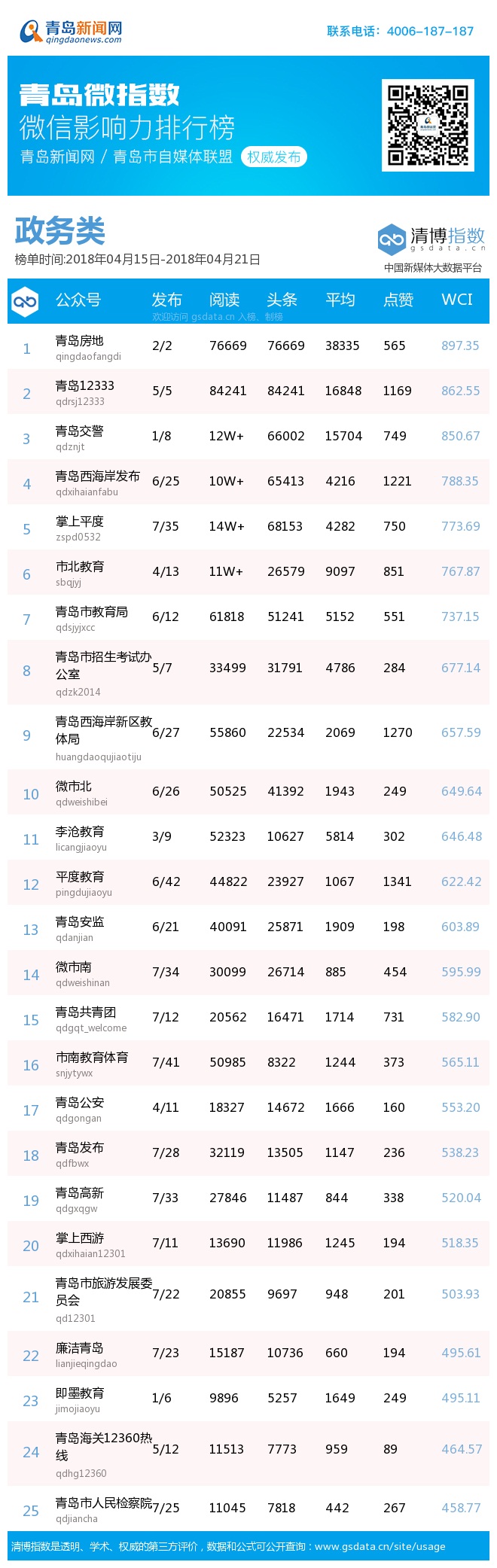 青島新聞網4月23日訊 (記者邢書玲)由青島新聞網、清博指數平臺聯手打造的“青島微指數微信影響力排行榜”今日發布一周(4.15—4.21)榜單。為進一步貫徹落實“房子是用來住的,不是用來炒的”定位,4月18日,青島市國土資源和房屋管理局官微“青島房地”發布《關于持續促進我市房地產市場平穩有序運行的通知》一文,該文章一經發布就引起極大反響,最終以閱讀70392次,點贊542次的成績,拿下政務類熱文榜第一名,憑借該文章,“青島房地”也首次奪得政務類冠軍。