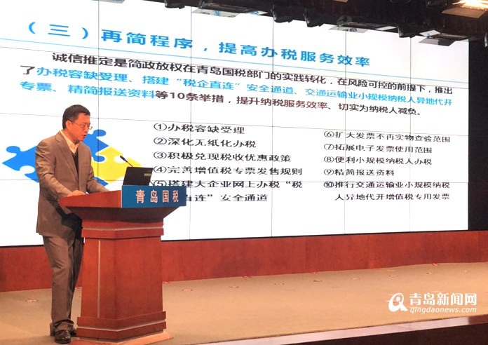 青島市國家稅務局黨組成員、總審計師郭洪源通報了《青島市國家稅務局關于推行誠信推定理念優(yōu)化稅收營商環(huán)境服務新舊動能轉換支持軍民融合發(fā)展的工作意見》。他表示,青島市國稅局在認真總結近年來全市國稅系統(tǒng)稅務柔性行政工作經驗的基礎上,從再降門檻、再減程序、再轉理念,再優(yōu)管理,再遵規(guī)則,再強監(jiān)控等六個方面40項具體措施推行誠信推定,涵蓋了絕大部分的日常稅收管理工作。這一意見的實施,將進一步推動青島稅務系統(tǒng)“放管服”改革,持續(xù)優(yōu)化營商環(huán)境,推動新舊動能轉換,助力誠信企業(yè)發(fā)展。