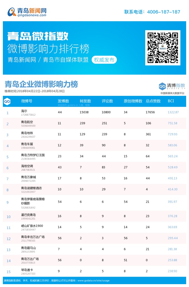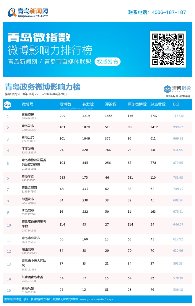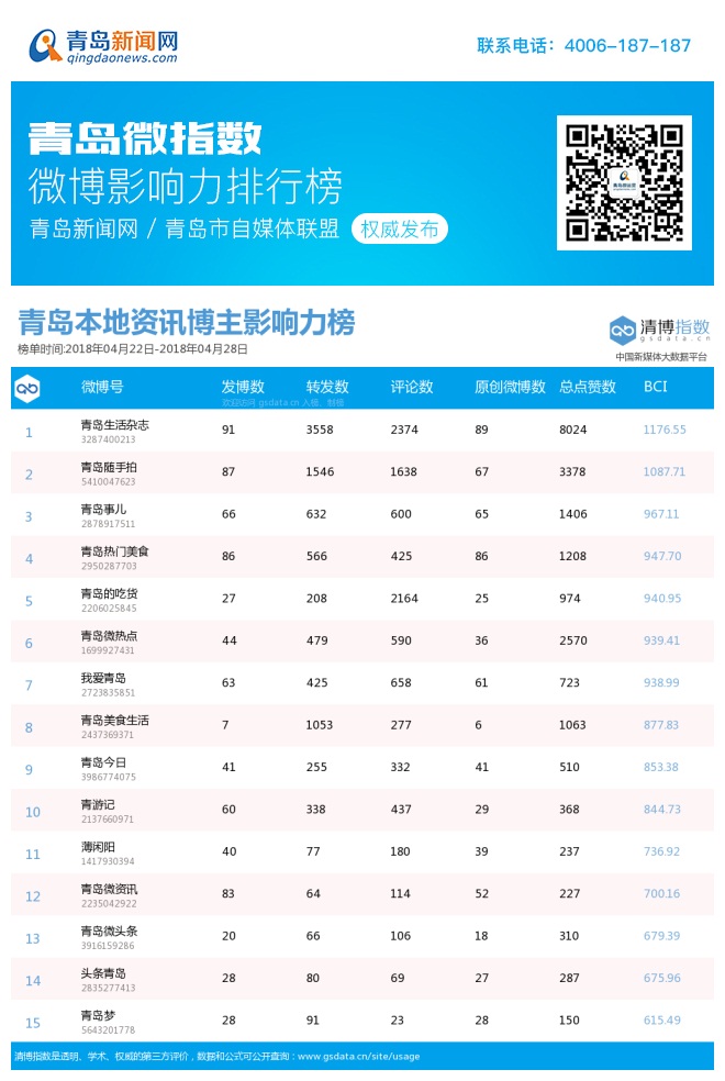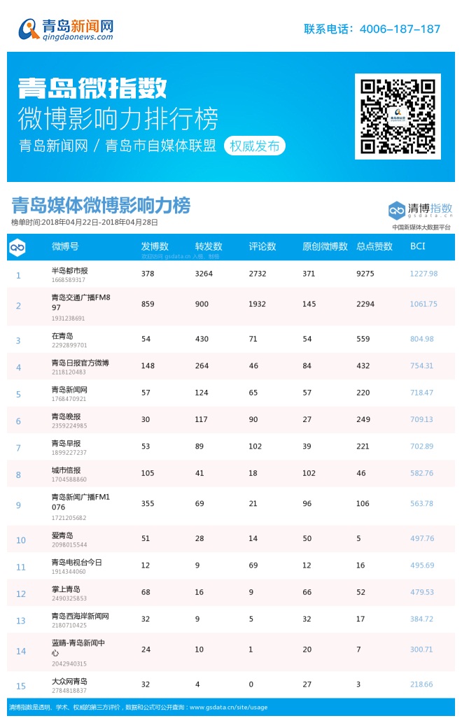 青島新聞網5月2日訊 (記者邢書玲)由青島新聞網、清博指數平臺聯手打造的“青島微指數微博影響力排行榜”今日發布一周(4.22—4.28)榜單。