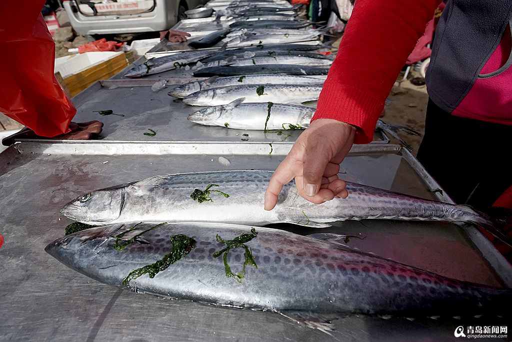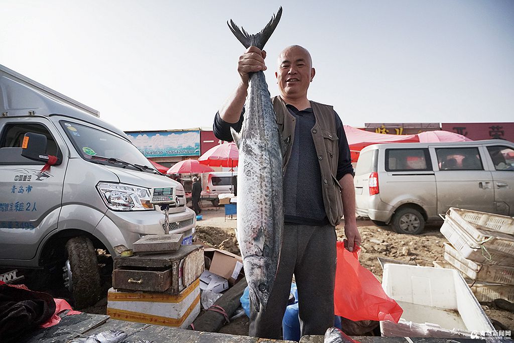 沙子口大集,商戶展示個頭碩大的本地春鲅魚