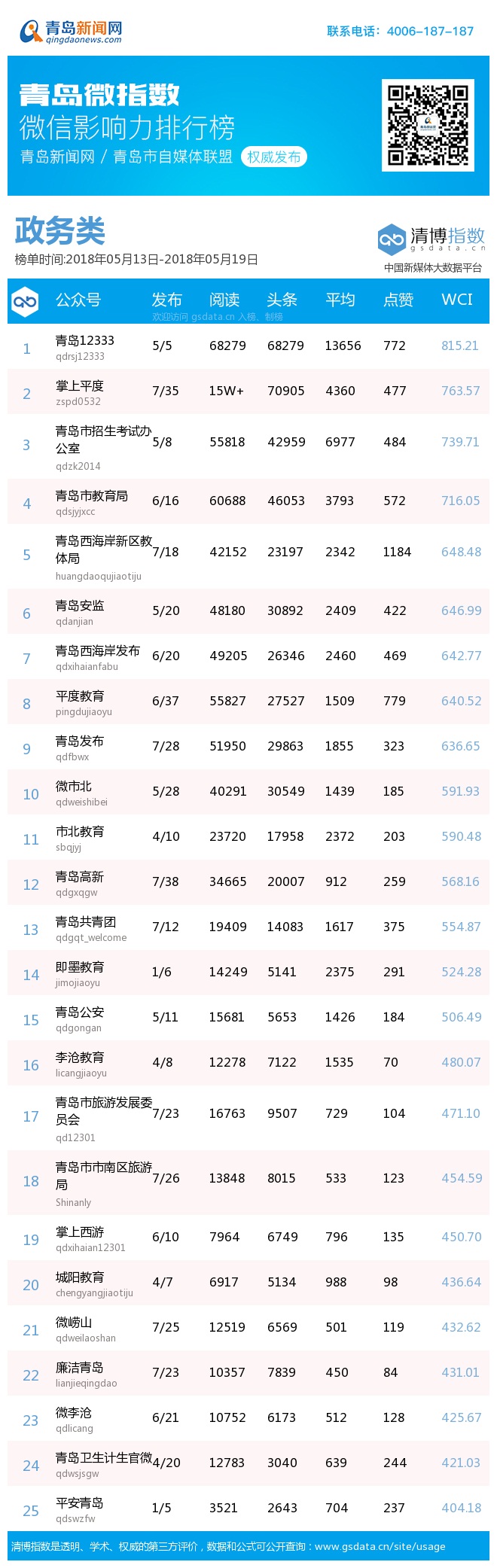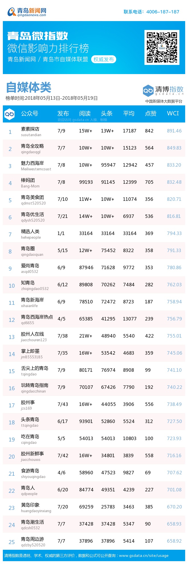 青島新聞網(wǎng)5月21日訊 (記者邢書玲)由青島新聞網(wǎng)、清博指數(shù)平臺聯(lián)手打造的“青島微指數(shù)微信影響力排行榜”今日發(fā)布一周(5.13—5.19)榜單。