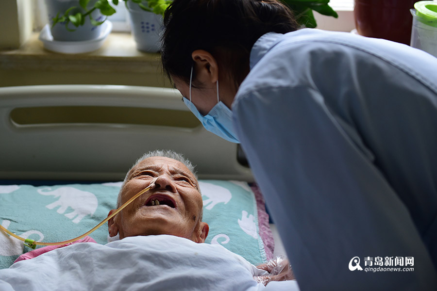44床有位104歲的老人,也是王曉燕轄區內歲數最高的一位老人,別看老人歲數大,但是腦子一點不糊涂,趕上曉燕過來給老人翻身,老人總是對她笑。