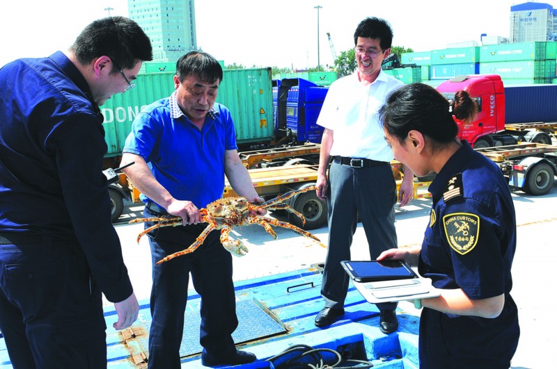 海關人員為來自俄羅斯的帝王蟹辦理通關手續。