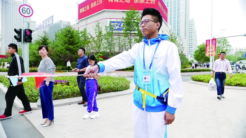 來自青島大學(xué)的志愿者孫盛泉在香港中路進(jìn)行志愿服務(wù)。湯臻 攝