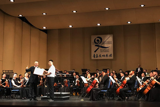 青島新聞網7月2日訊(記者 張力偉)昨晚7點半,世界著名作曲家、指揮家譚盾執棒青島交響樂團,為島城樂迷帶來了“青島之聲”專場音樂會。本場音樂會除了上演斯美塔那《沃尓塔瓦河》、門德爾松《e小調小提琴協奏曲》以及譚盾的《定音鼓協奏曲》和布里頓的《大海的間奏4首》等曲目外,青島交響樂團也正式向譚盾頒發聘書,聘請其擔任樂團榮譽指揮?,F場,譚盾向島城樂迷發出邀請:明年6月譚盾音樂周再見。
