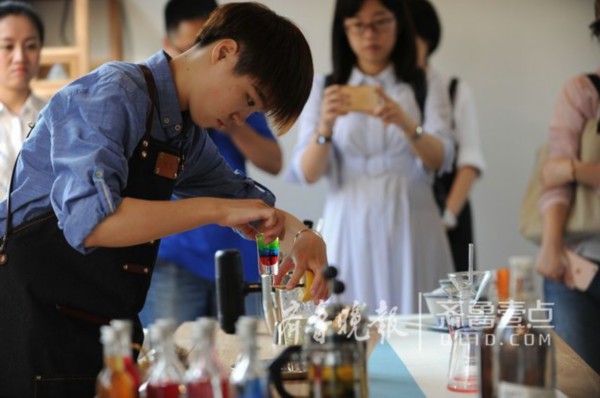 龍塢茶鎮內,一位工作人員在展示用龍井茶制作的飲品。