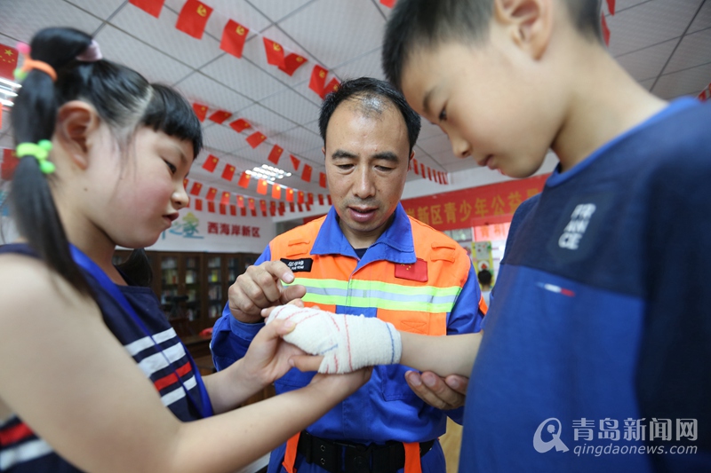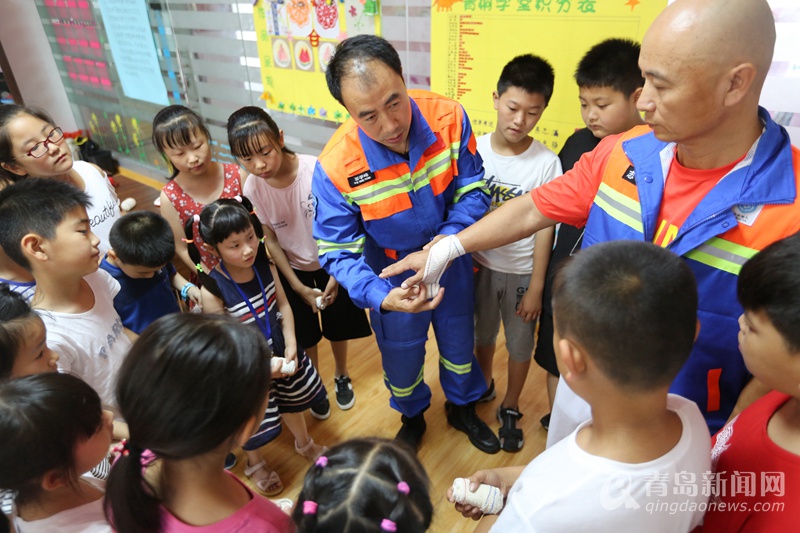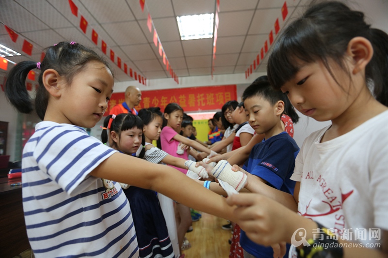 7月20日,同學們在青島藍天救援隊鄔學鋒、葉斌兩位隊員的指導下學習如何對傷口進行包扎。(張進剛 攝)