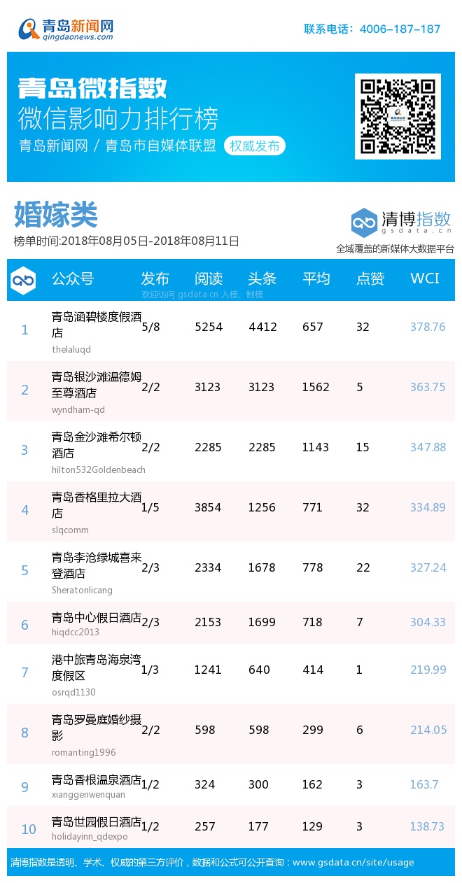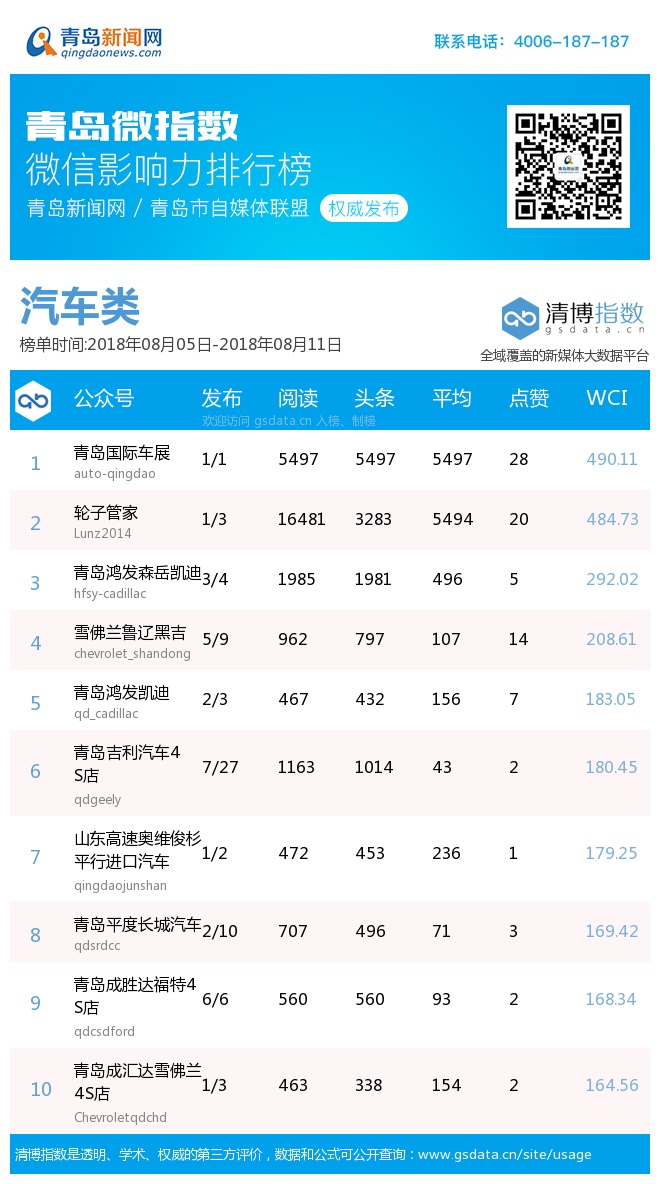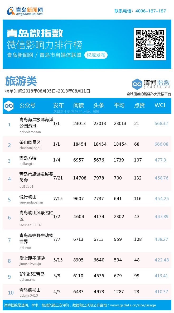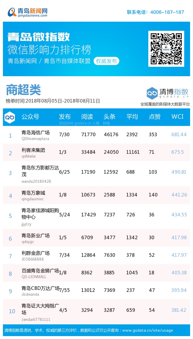 3、本次榜單收錄了青島14個行業微信公眾號,如您的賬號暫未收錄,可聯系4006-187-187。