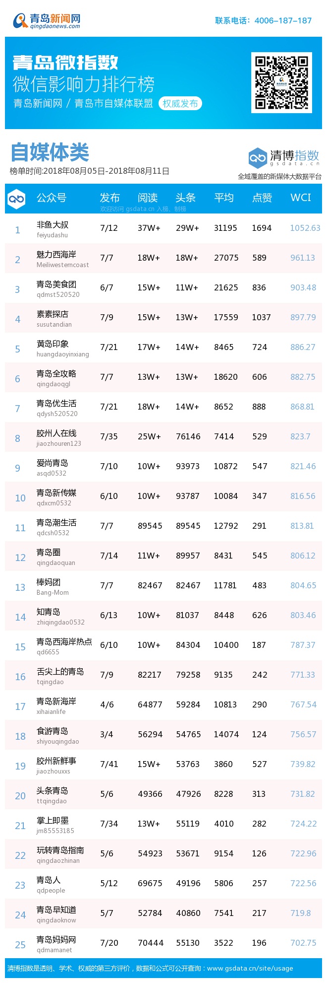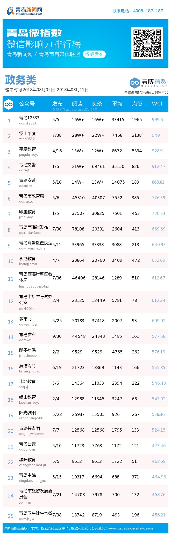 青島新聞網8月13日訊(記者 邢書玲)由青島新聞網、清博指數平臺聯手打造的“青島微指數微信影響力排行榜”今日發布一周(8月5日-8月11日)榜單。