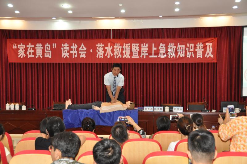 上午九點半,讀書會開始。首先,由西海岸新區第一高級中學的劉勝本老師向大家講解了海上自然災害現象及成因、游泳流域的安全判斷等常識。隨后,由原山東省游泳隊運動員、資深游泳教練辜英忠老師向大家講解了發生溺水事故的常見原因和在水中如何進行自救、互救等常識。最后,來自西海岸新區中心醫院的外科醫生李寧波大夫為大家講解并親自示范了對溺水者實施緊急心肺復蘇的常識與技能。
