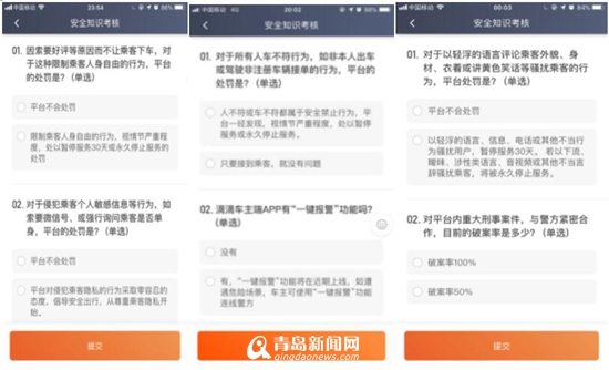 今天起持續十天,滴滴司機們每天打開車主端APP,除了要進行人臉識別外,還需要參與安全知識問答。每次考試包括兩道選擇題,兩題均回答正確才算通過,如果兩題中有一題回答錯誤則為考試失敗,司機需要重新考試直到通過,才能正常出車。選擇題內容涵蓋了出行過程中的多項安全相關問題,比如滴滴安全保障制度、違反安全服務規則的處罰措施、“一鍵報警”等APP內安全功能的使用方式、安全駕駛規范以及如何與乘客文明友好溝通等。