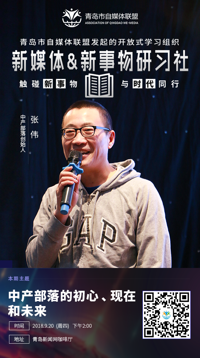 本期新媒體&新事物研習社邀請到了青島地區(qū)規(guī)模最大的中產(chǎn)階層社群——“中產(chǎn)部落”創(chuàng)始人張偉?!爸挟a(chǎn)階層”定位為中產(chǎn)階層的私人助理,通過社區(qū)部落、同學會、俱樂部等不同組織形式讓中產(chǎn)階層找到更多同道中人,共同追求健康向上的生活方式。“中產(chǎn)部落”堅持“平等是一切的基礎,規(guī)則是一切的保證,自由是一切的目標”原則,這讓它區(qū)別于其他社群組織,獨具濃厚精神氣質(zhì)。它始于理想主義的美麗愿景,追求普世的幸福、平等和自由,最終走向何方,也是本期新媒體&新事物研習社將要一起探討的課題之一。