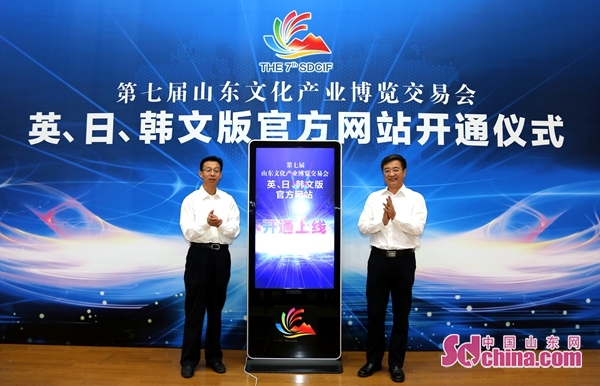 山東省委宣傳部副部長、第七屆山東文博會協調領導小組副組長王少杰(右),濟南市委宣傳部常務副部長、第七屆山東文博會執委會辦公室主任孫常建(左)共同開通第七屆山東文博會英、日、韓文版官方網站。